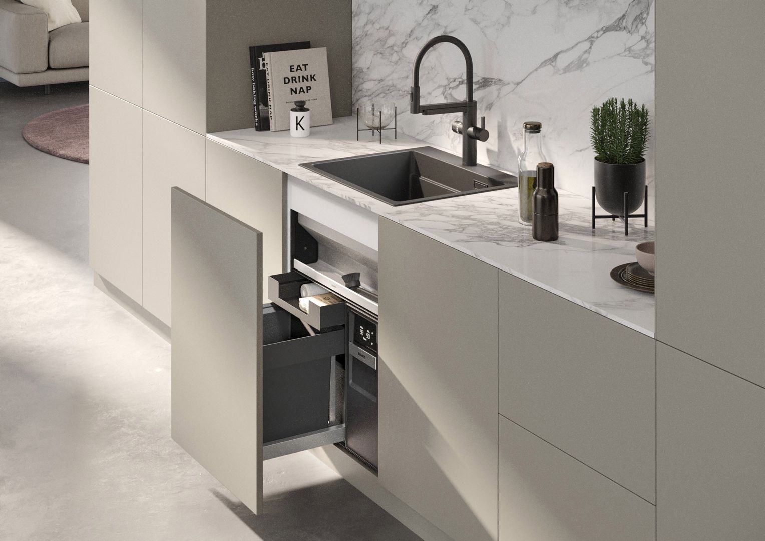 Profi-Tipp von Gupfinger: In der Küche geht es immer auch um Platz, Stauraum und darum, alles griffbereit zu haben. Clevere Lösungen schaffen Raum. Wenn Geschirrspüler, Küchenmaschinen oder andere technische Geräte intelligent angeordnet werden, kann jeder Winkel genutzt werden, was besonders in kleineren Küchen wichtig ist.